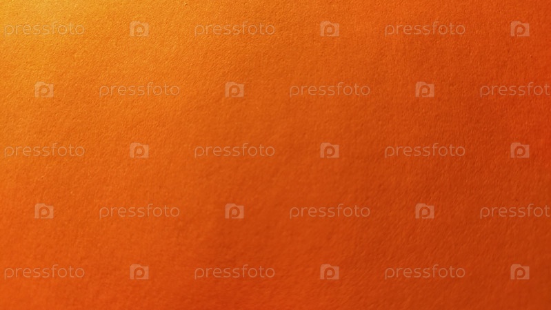 Лист плотной бумаги ярко-оранжевого цвета. Крупный план. Фон интенсивного оттенка. Естественное боковое освещение. Тонкая текстура картона или бумаги. Световой градиент по степени освещенности