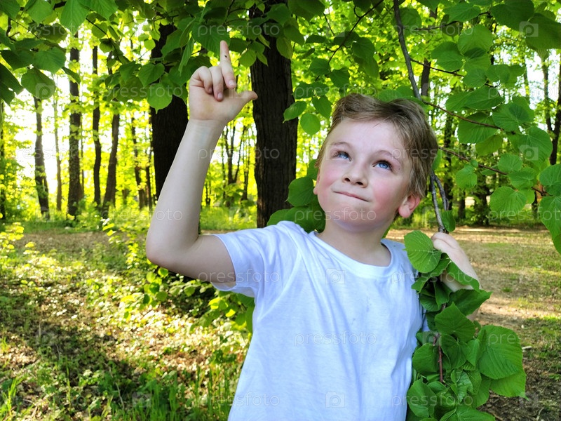 Красивый позитивный мальчик поднимает руку и указывает указательным пальцем вверх в знак того, что ему пришла в голову какая-то блестящая идея или мысль. Малыш в лесу