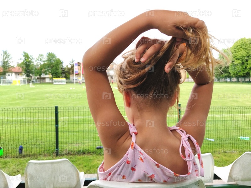 Молодая темнокожая красотка завязала волосы. Девушка фотографируется со спины на фоне футбольного поля. Формирование хвоста из волос. Сербия, Белград