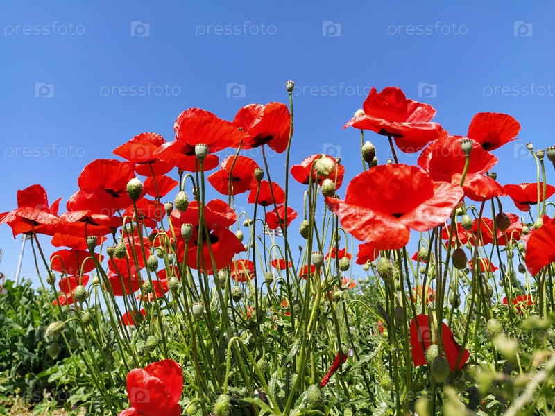 Цветущие ярко-красные маки на поле. Дикие красивые цветы. Голубое небо на заднем плане. Нежные лепестки цветов блестят на солнце. Распускание бутонов мака. Размытое боке