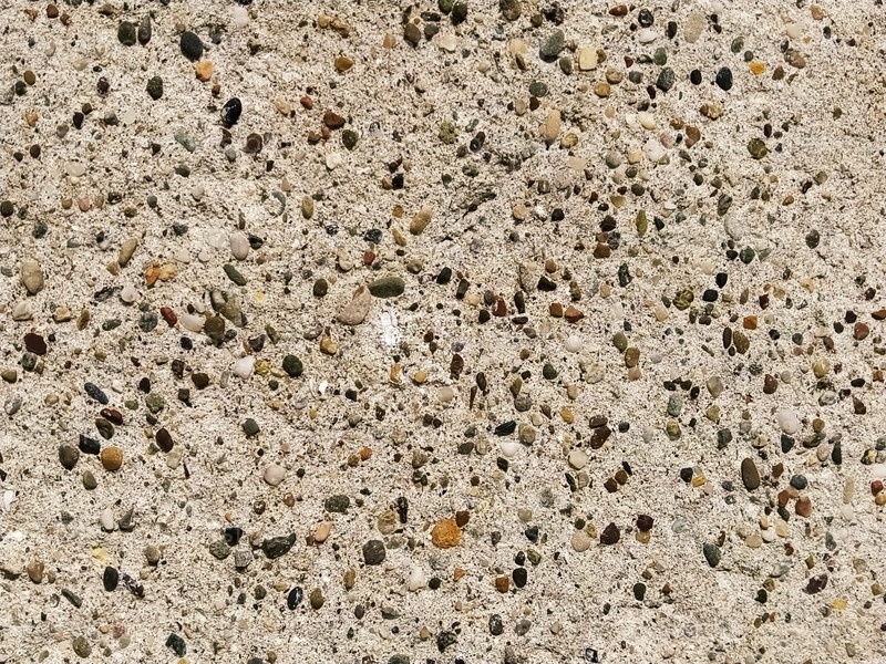 Бетонная поверхность с разноцветными вкраплениями мелких камней. Светло-бежевый тон. Стена здания или бетонная плита. Крупный план. Рябая поверхность цемента. Вариант внутренней или внешней отделки