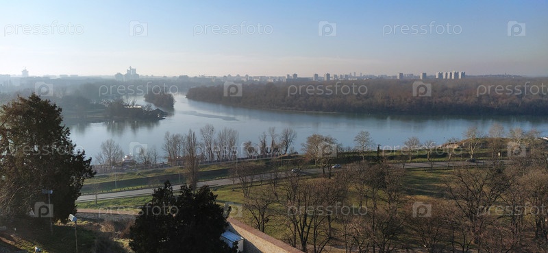 Белград, Сербия. Вид с Калемегдана на реку Дунай и остров Ратный. Место слияния рек Савы и Дуная. Осенне-зимнее время. Пейзаж - баннер