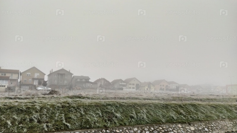 Холодный зимний день в сельской местности. Трава покрыта инеем. Густой туман. На заднем плане жилые дома