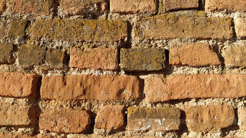 Старинная кирпичная кладка. Стена в культурно-историческом комплексе Белградской крепости, Сербия. Солнечное вечернее освещение. Теплые коричневые, красные, оранжево-бежевые тона. Разрушение камня