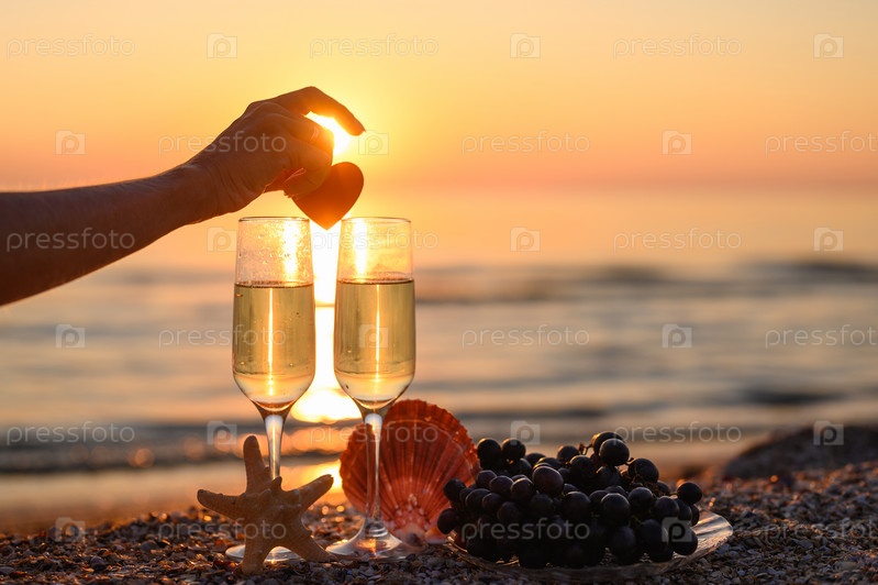 Женская рука кладет сердце на бокалы с шампанским на пляже на фоне заката. Подготовка к романтическому вечеру. Селективный фокус на руке и на стекле, узкий фокус