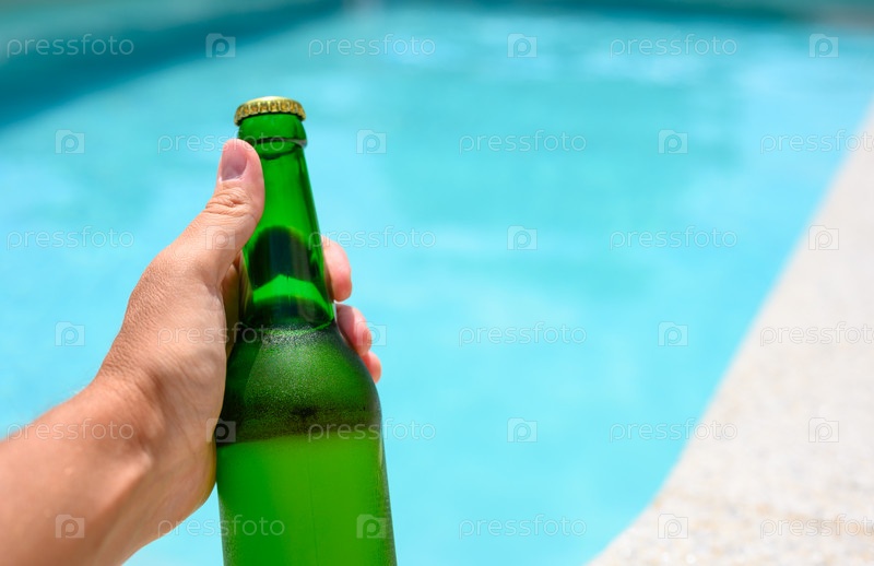 Бутылка холодного пива в мужской руке на фоне бассейна в жаркий день. Селективный фокус на бутылке
