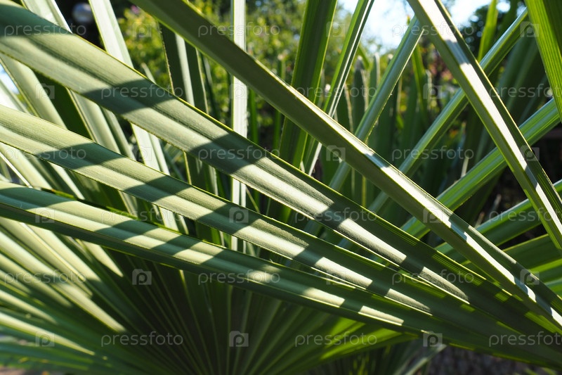 Текстура пальмовых листьев с тенью и светом. Пальмовые листья ярко-зеленого цвета. Тропический красивый фон. Летний пляжный туризм