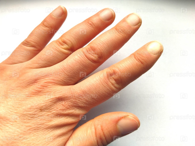 Женская рука с сухой атопической кожей. Белый фон. Крупный план кожи на руках и пальцах. Дерма нуждается в уходе и увлажнении. Морщины, сухость и раздражение поверхности. Стриженые натуральные ногти