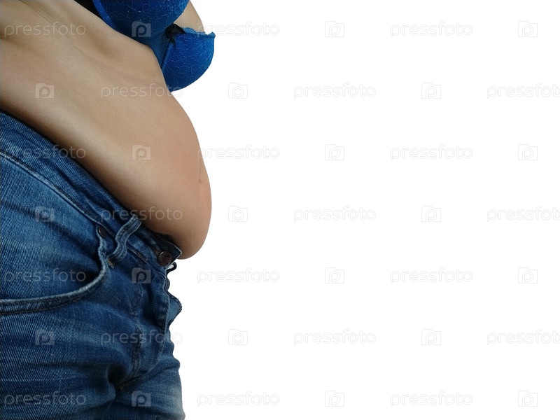 Обвисший живот. Складки кожи и жира по бокам нависают над талией джинсов. Фигура, испорченная перееданием или беременностью. Ожирение и диабет. Белый фон. Целлюлит дряблых мышц