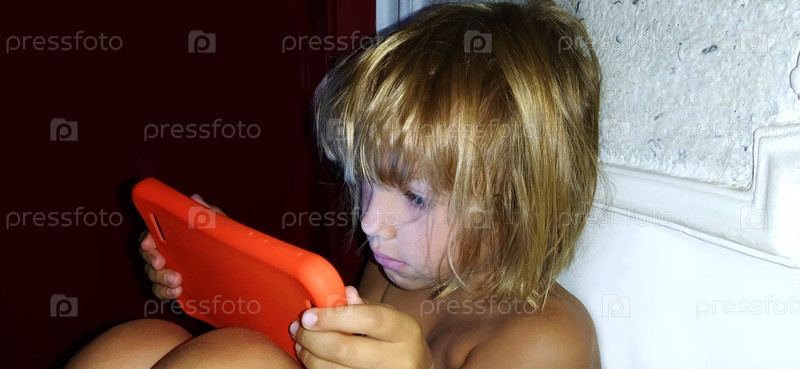 Милая маленькая девочка играет с планшетным компьютером. Ребенок 7 лет с серьезным лицом и светлыми волосами смотрит в гаджет. Скопируйте пространство. Девушка в комнате. Темная и светлая стена. Вечером дома