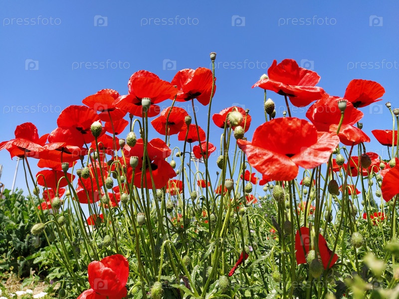 Красивые красные маки и голубое небо. Фото сбоку. Дикие маки на поле, панорамный снимок