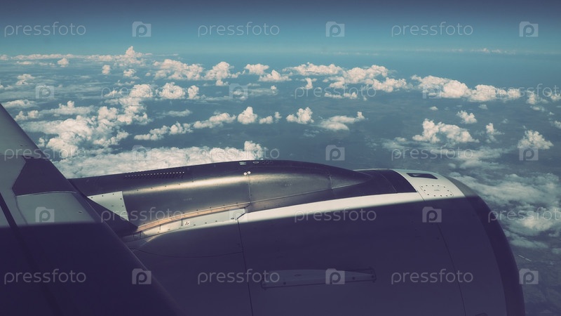 Авиадвигатель, крыло на краю тропосферы. Горизонт над Землей. Военный самолет. Космические войска. Война и мир. Облака голубого неба. Полет над гористой местностью, движение над облаками