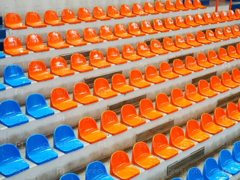 Трибуны, свободные места на трибунах арены или зрительного зала. Ряды синих и оранжевых сидений на стадионе без зрителей. Концепция отмены спортивно-массовых зрелищных мероприятий