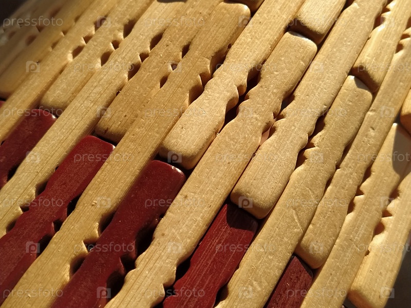 Тростник или деревянная циновка. Коврик представляет собой коврик под жаркое. Вязаные палочки из обработанного дерева с закругленными краями. Крупный план. Желтый, коричневый и бежевый цвета. Боковое освещение. Традиционная текстура бамбуковой подушки