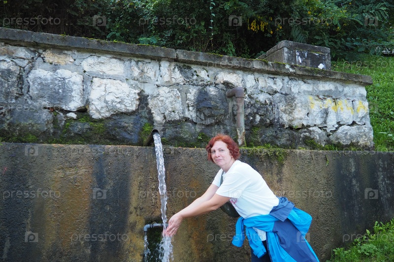 Баня Ковиляча, Лозница, Сербия. Гора Гучево, парк и лес. Источник минеральной серно-железистой воды Ильиджа Чесма Чесма. Струя воды льется из крана в бетонной стене. Девушка
