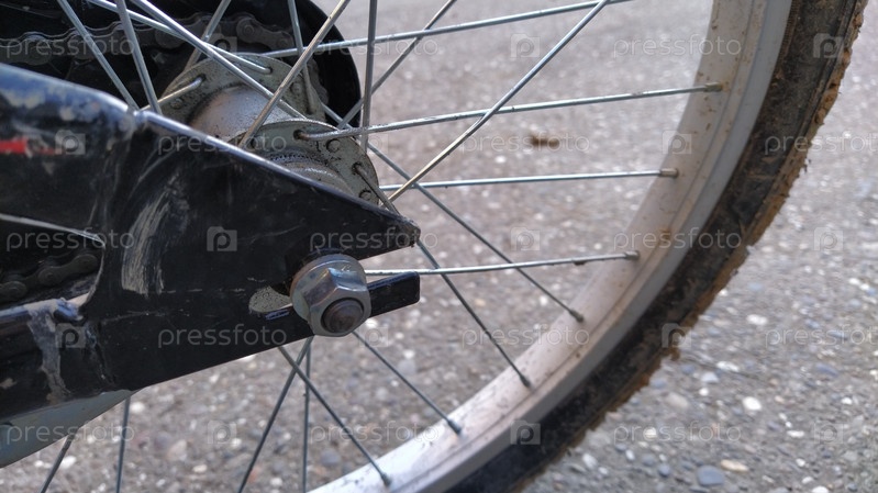 Велосипедное колесо Стальные спицы и центральное крепление колеса к раме велосипеда крупным планом. Гайка на болт. Металлические детали качественно собраны в изделие. Глина и грязь прилипли к резиновой шине