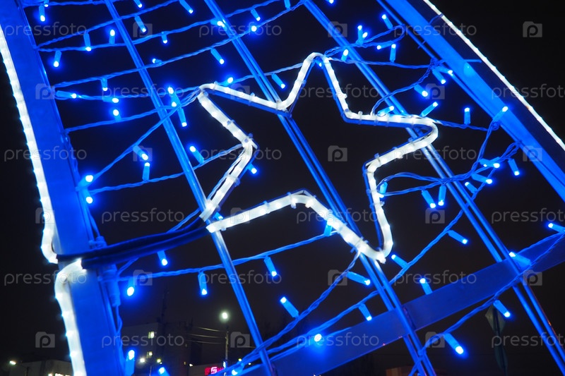Синие уличные гирлянды. Расфокусированное боке. Праздничный фон. Синие и белые лампочки как украшение для новогодней и рождественской ночи. Украшение улицы. Абстрактные световые пятна. Форма звезды