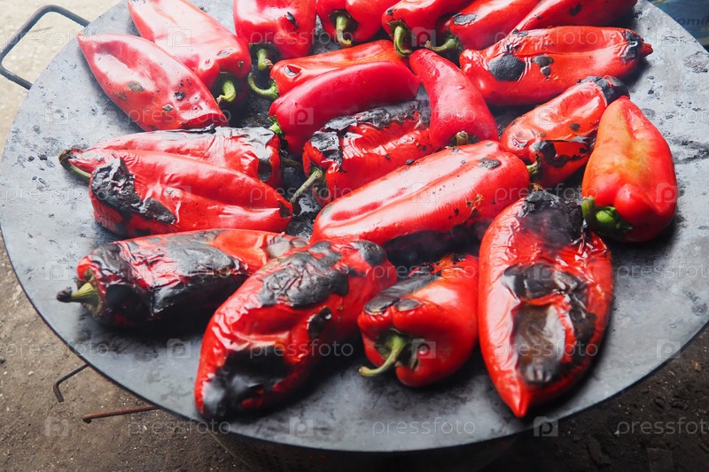 Жареный вкусный красный перец для аромата дыма и быстрой очистки. Балканские рецепты салатов. Термическая обработка урожая перца на металлическом круге. Перец выложен на плоском противне крупным планом