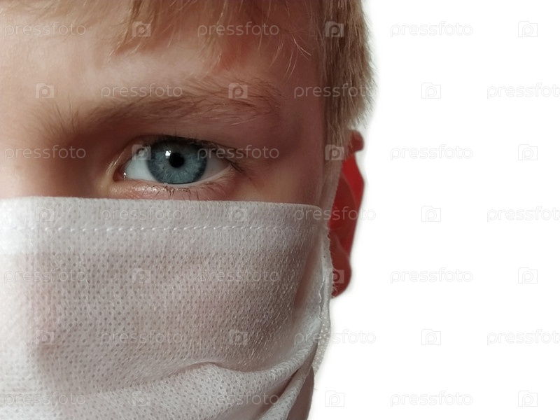 Ребенок в маске. Лицо 7-летнего мальчика в защитной белой хирургической маске крупным планом. Школьник со светлыми волосами и серо-голубыми глазами на белом фоне