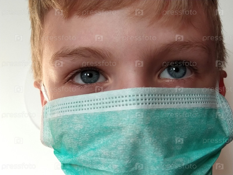 Ребенок в маске. Лицо 7-летнего мальчика в защитной хирургической маске крупным планом. Школьник со светлыми волосами и серо-голубыми глазами на белом фоне. Посмотрите вверх и в сторону