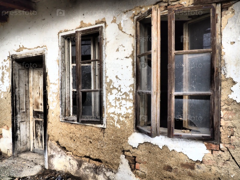 Старый дом с окнами и дверью. Разрушающийся сельский дом. Концепция урбанизации и забвения Родины. Заброшенный дом. Разбитое стекло в окне и падающая штукатурка. Сербия. Балканы