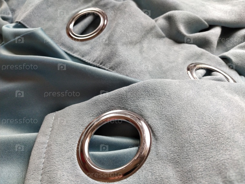 Два металлических люверса на серо-голубых бархатных портьерах