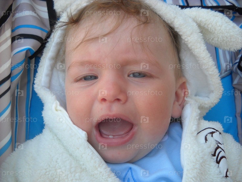 Плачущий ребенок. Симпатичный маленький мальчик в белом комбинезоне сидит в коляске. Детские капризы и гримасы. Белый и синий цвета для одежды и коляски. Кавказский эмоциональный ребенок