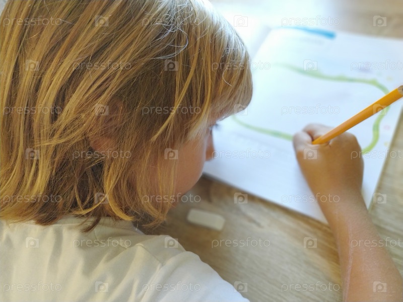 Девочка 6 или 7 лет рисует в книге. Ребенок делает домашнее задание. Светлые волосы и очки в розовой оправе. Концепция обучения и образования