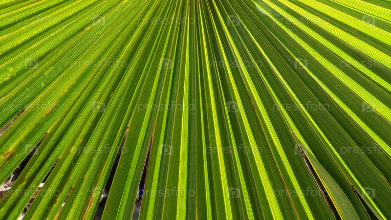 Текстура пальмовых листьев с тенью и светом. Пальмовые листья ярко-зеленого и желтого цветов. Тропический красивый фон. Летний пляжный туризм