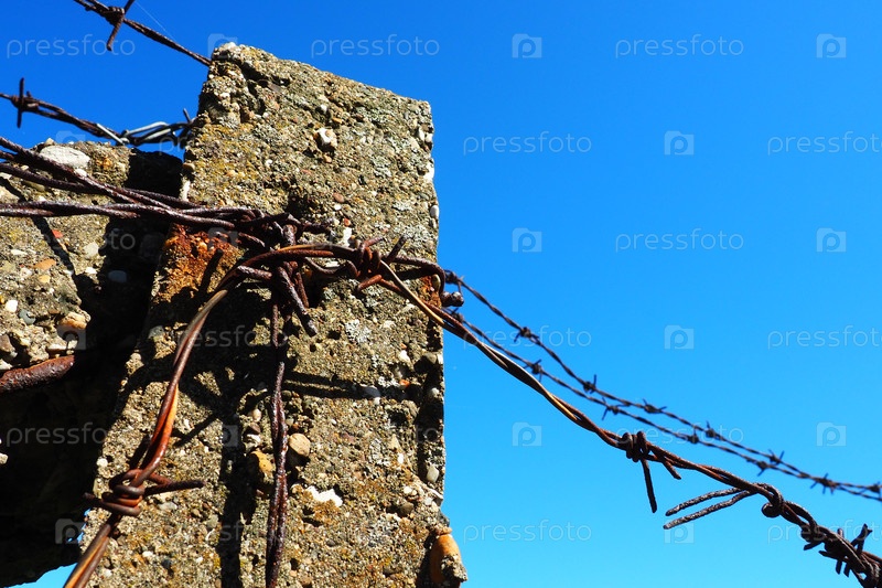 Колючая проволока, двойная проволока, металлическая лента с острыми шипами для заграждений. Ржавая колючая проволока на фоне голубого неба. Понятие войны, ограничение прав и свобод. Бетонный столб