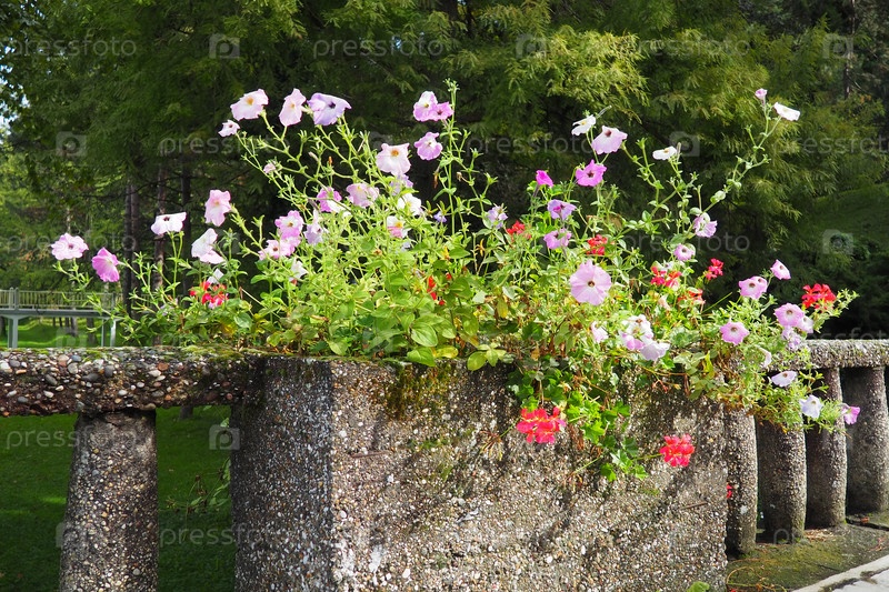 Петуния — род тропических травянистых или полукустарниковых многолетних растений семейства пасленовых. Красные, розовые, белые петунии на старой каменной балюстраде в Баня Ковиляча, Сербия
