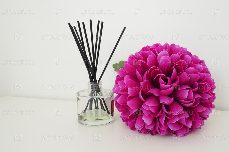 Композиция с ароматическими палочками, эфирным маслом в стеклянной вазе и ярким розово-сиреневым махровым искусственным цветком в интерьере белой комнаты. белый фон