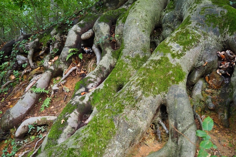 Корни покрыты зеленым мхом. Баня Ковиляча, Сербия, террасный парк. Корень — подземная часть растения, служащая для его укрепления в почве и поглощения из нее воды и питательных веществ