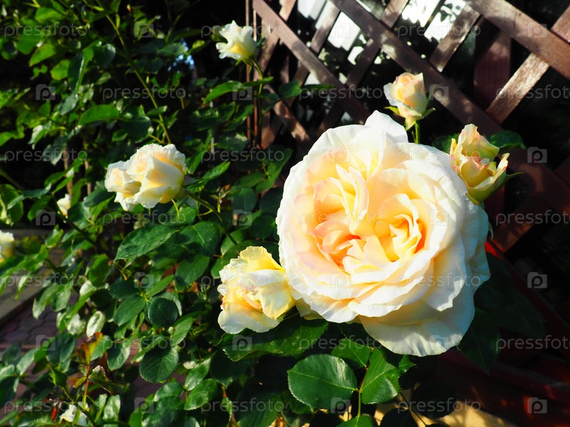 Красивые большие махровые розы в саду на фоне зеленых листьев и деревянной решетки. Украшение сада, сада и газона. Цветоводство, садоводство, ботаника и сельское хозяйство