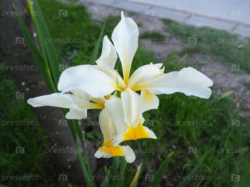Ирис — род многолетних корневищных растений семейства Ирисовые. Декоративное растение с крупными яркими цветками. Изящный нежный цветок белого цвета с желтыми прожилками. Зеленые листья на заднем плане