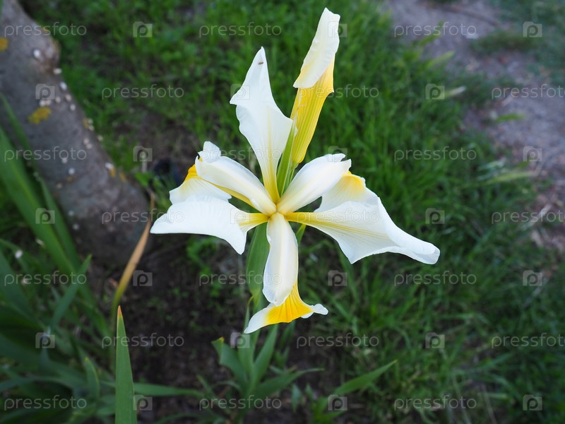 Ирис — род многолетних корневищных растений семейства Ирисовые. Декоративное растение с крупными яркими цветками. Изящный нежный цветок белого цвета с желтыми прожилками. Зеленые листья на заднем плане