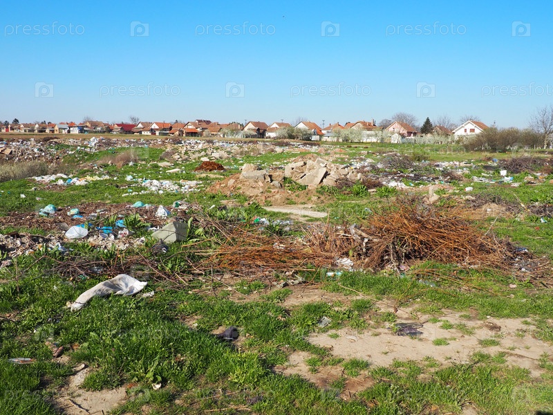 Мусорная свалка возле пос. Хаотичная неофициальная свалка. Пластик, пакеты, бумага, стекло, биологические отходы. Зеленая трава рядом с грязью. Экологическая катастрофа