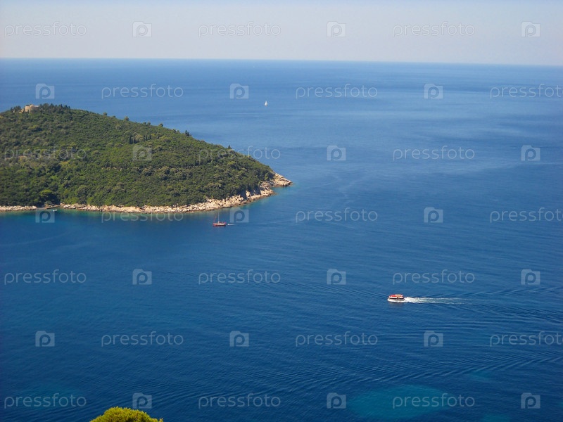 Аэрофотосъемка Адриатического моря. Остров недалеко от Дубровника, Хорватия. Красивая голубая морская гладь с кораблями, катерами и яхтами. Светлые пятна на воде