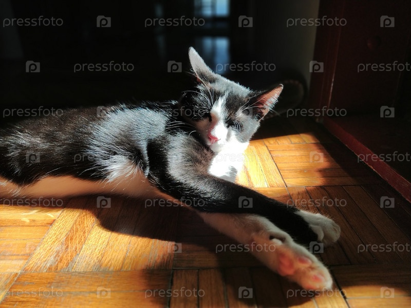 Кот греется на солнышке. Молодой черно-белый питомец лежит на полу под низким солнцем. Котенок закрыл глаза и наслаждается. Он навострил уши и контролирует происходящее вокруг