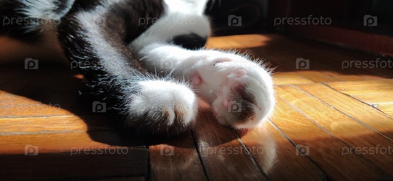 Лапы кошки лежат на полу. Черно-белый питомец протянул лапы и отдыхает. Кот греется на солнышке. Расслабленная поза. Мягкие подушечки на кошачьих лапках. Старый пол