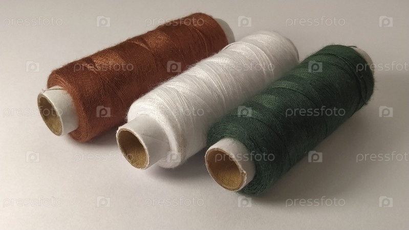 Шпульки и катушки ниток разных цветов - коричневого, белого и зеленого. Крупный план. Естественный свет слева. Мотки ниток. Швейные принадлежности