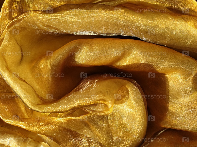 Органза желто-коричневого цвета с бежевым блеском. Блестящая, светоотражающая, красивая ткань для штор, тюлей. Вариант оформления интерьера. Скрученная, небрежно сложенная часть органзы на солнце