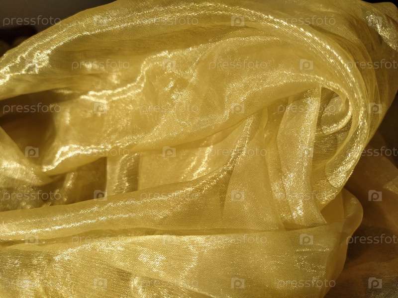 Органза желто-коричневого цвета с бежевым блеском. Блестящая, светоотражающая, красивая ткань для штор, тюлей. Вариант оформления интерьера. Скрученная, небрежно сложенная на солнце органза