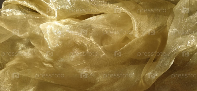 Органза желто-коричневого цвета с бежевым блеском. Блестящая, светоотражающая, красивая ткань для штор, тюлей. Вариант оформления интерьера. Скрученная, небрежно сложенная часть органзы на солнце