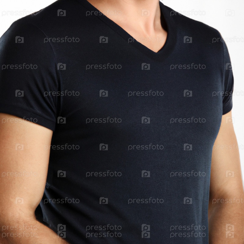 Шаблон черной футболки с изображением человека, носящего пустую классическую рубашку. Торс стройного взрослого мужчины в черной футболке. копирайт. Реклама одежды. Макет для вставки надписи