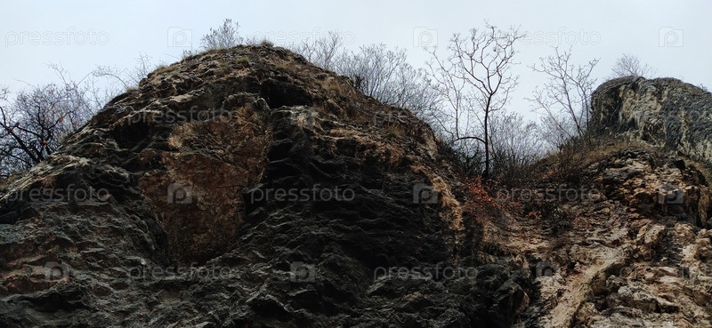 Скалистая скала с кустами, вид снизу вверх. Скалы после взрывных работ для прокладки дороги. Босния и Герцеговина, Сараево. Страшные скалы, свисающие с кустов без листьев. Черные силуэты деревьев