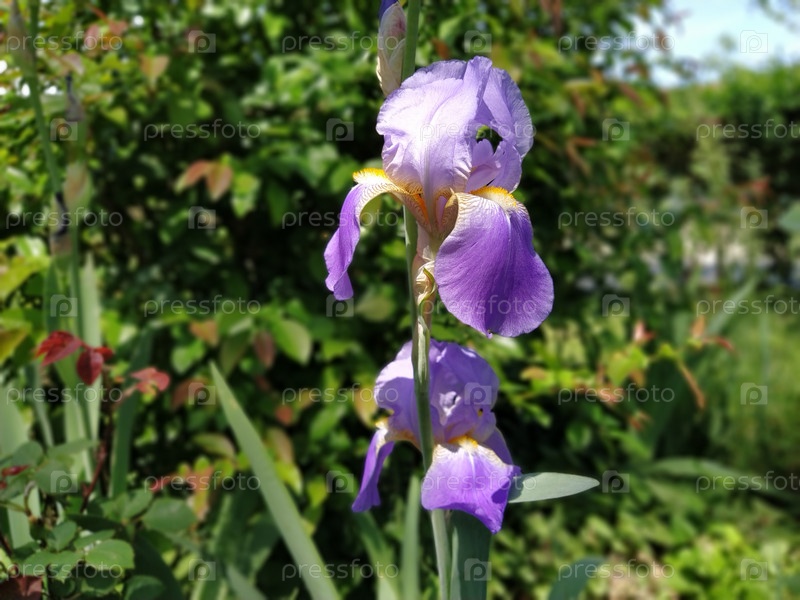 Красивая фиолетовая радужка с белой серединой. Изогнутые изящные яркие лепестки цветка. Зеленый размытый фон. Селекционный сорт ириса. Большой распустившийся бутон. Тонкие длинные листья