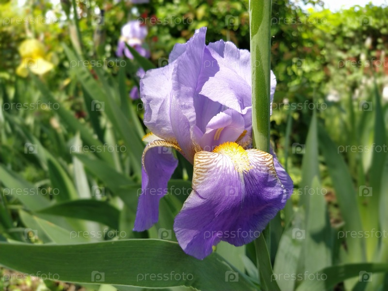 Красивая фиолетовая радужка с белой серединой. Изогнутые изящные яркие лепестки цветка. Зеленый размытый фон. Селекционный сорт ириса. Большой распустившийся бутон. Тонкие длинные листья