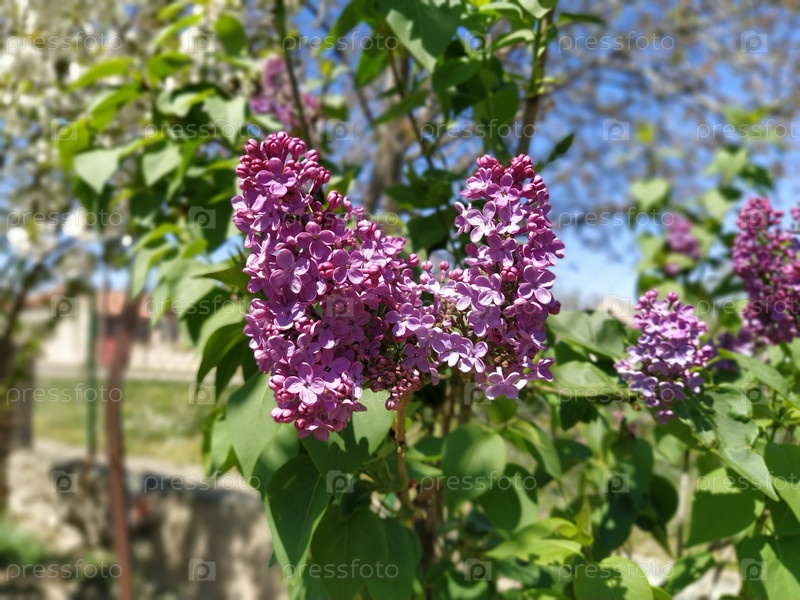 Красивые нежные сиреневые цветы на кусте в саду. Букет сирени крупным планом. Размытое боке