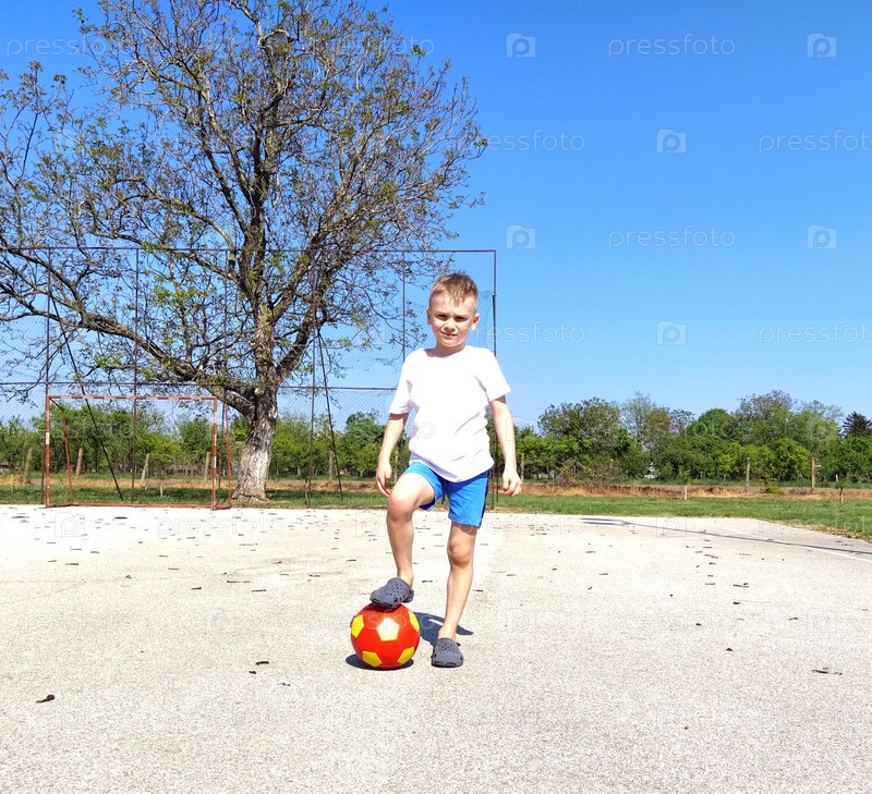 Молодой футболист. Мальчик с мячом. Ребенок наступил на мяч ногой. Малыш 7 лет в белой футболке. Асфальтовая спортивная площадка или корт